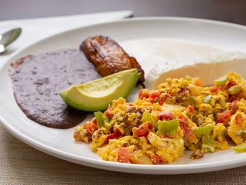 Scramble eggs with veggies or chorizo, refried beans, plaintans, white cheese, avocado and toasted bread or tortillas. / Frijoles Fritos, platanos, huevos con verduras o con chorizos, arroz casamiento, queso, aguacate, y pan tostado o 2 tortilla calientes.
