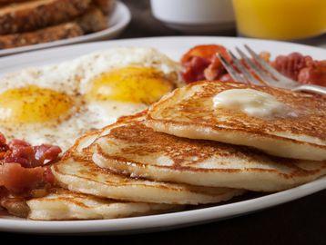 *3 pancakes, 2 fried eggs, 4 Bacon strips and a side of your choice ( a hashbrown or a toast)