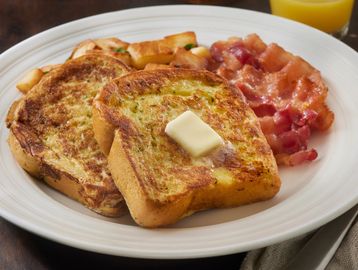 *2 French toast, Omelette, 2 Bacon strips and a side of your choice (2 hashbrown or home fries)