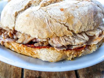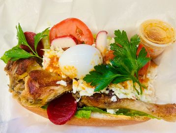 Chicken, fresh lettuce, tomato, radish, hard- boiled egg, creamy Salvadoran crema, crunchy slaw, served with a toasted Salvadoran French bread