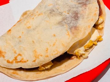 Made with a thick tortilla filled with refried beans, salty crumbled cheese, Honduran style sour cream, avocado, scrambled eggs, protein of your choice: